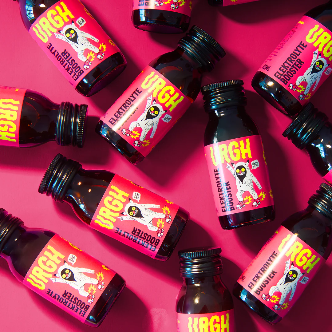 URGH funktioniert gleich auf zwei Ebenen: Einmal sind da megaviele Elektrolyte drin. Wenn du URGH vorm Schlafen ext, dann fängst du schon im Schlaf an, deine Elektrolyte-Speicher wieder aufzufüllen. Zum Zweiten gleicht URGH deinen verwackelten Säure-Basen-Haushalt aus. In einfach: sauer (URGH) + sauer (dein Körper) ergibt gleich basisch. Doppelt Kater adé! Dafür werden wir bestimmt abgemahnt aber lieber einfach erklärt, als immer alles richtig machen.